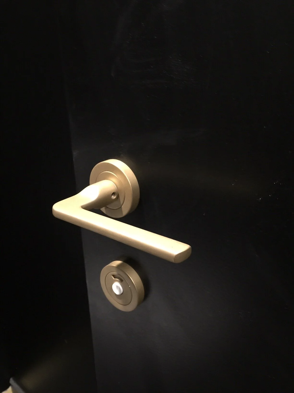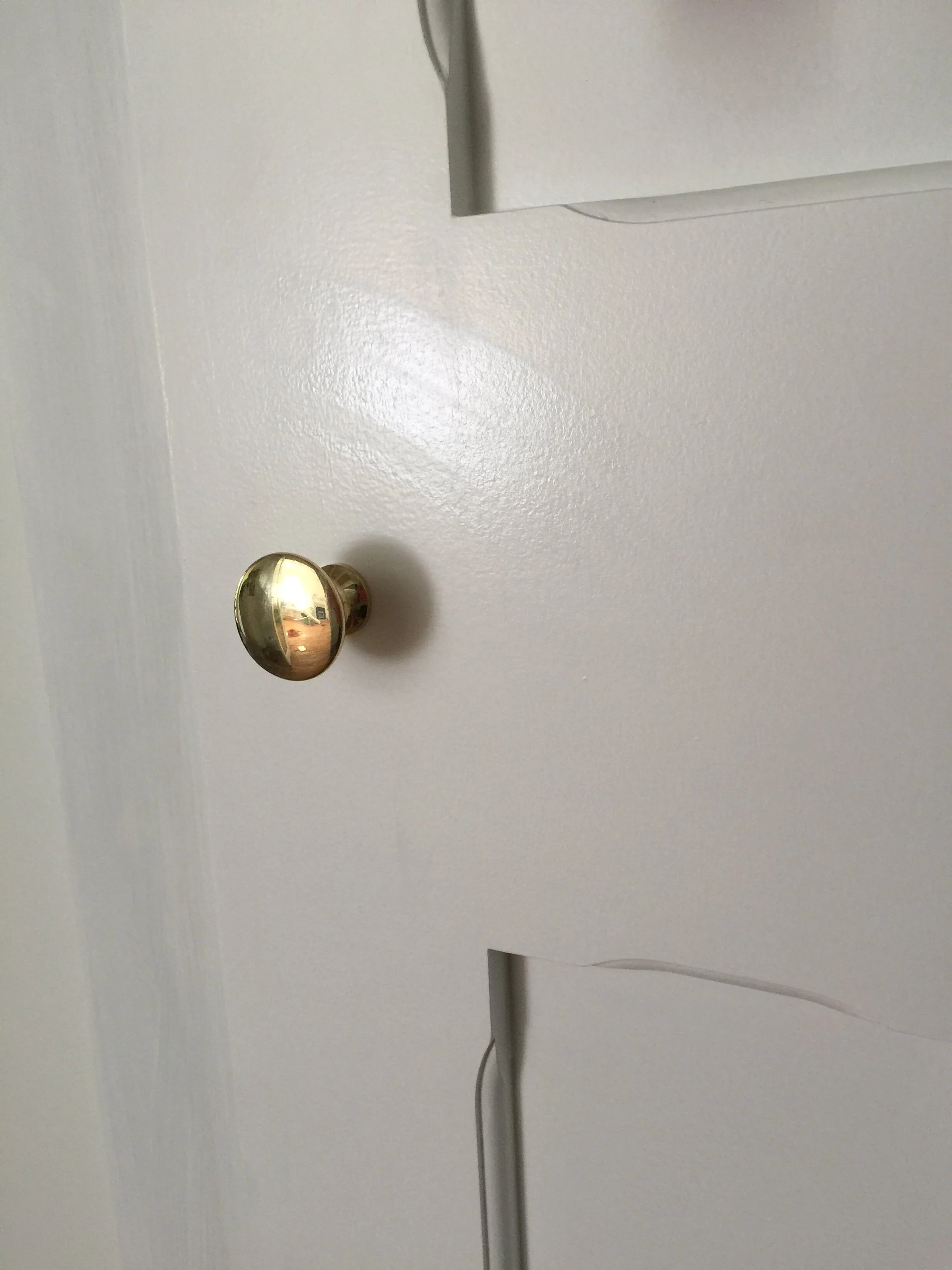 A close-up of a white door with a black handle and a key inserted into the door lock. The key is attached to a keyring with two small keys.